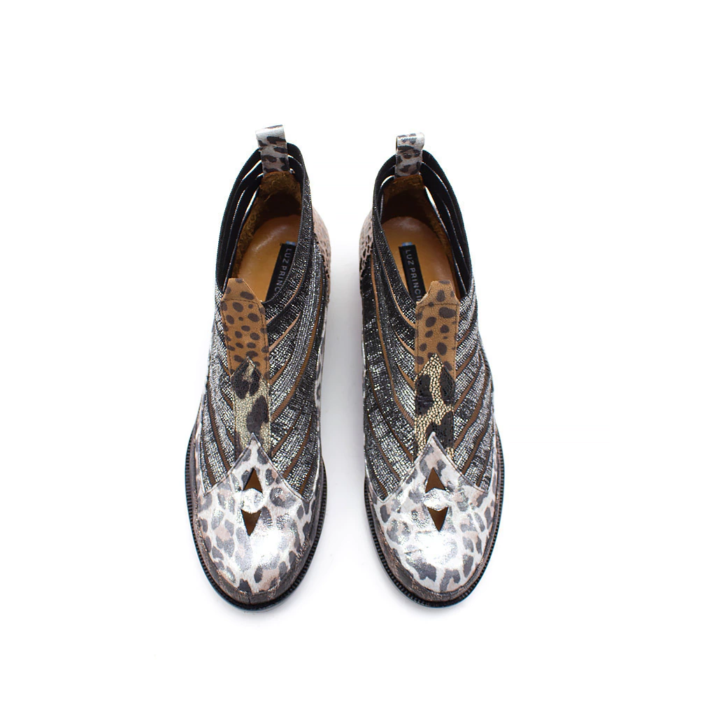 Esta botineta-guante ya es un item icónico de nuestra marca, junto con el modelo VINO. Se realiza todo el año, por su versatilidad para usar con o sin medias. Comenzamos con los primeros modelos en 2020, y no paramos hasta hoy!. Cada temporada creamos nuevas combinaciones, mejorias y reversiones a pedido de nuestras clientas. La capellada está calada y lleva terminacoon de elastico con transparencias y lurex. Vaiedad de cueros animal print y satinados o grabados y negro. Forro vacuno. Taco 3,5cm. Base suela, con media suelina goma antideslizante.