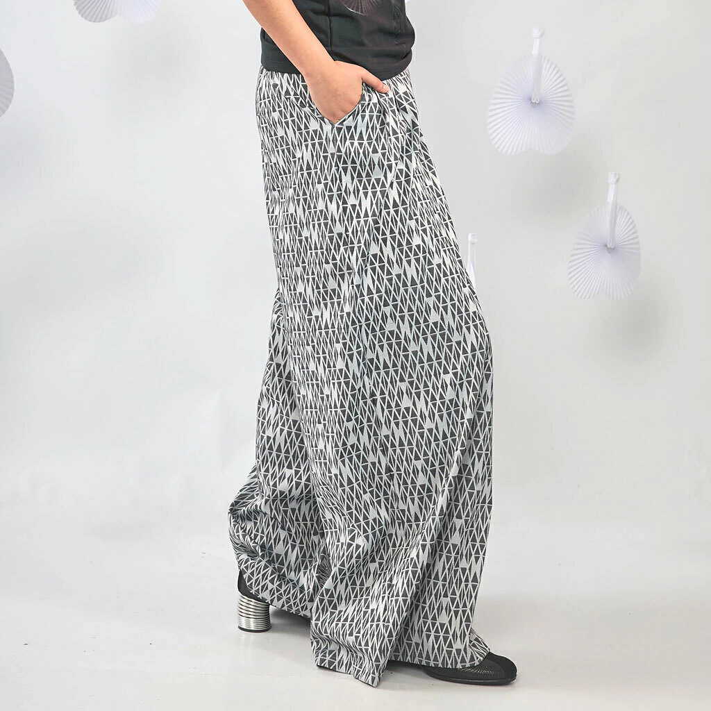 WONTON es un pantalon sastre para destacar. Esta confeccionado en satiné labrado. De textura suave, combina dos tonos de gris que generan por el contra hilo un juego de luces y sombras. Corte ancho y fluido que resulta muy comodo. Tiro medio justo debajo del ombligo.