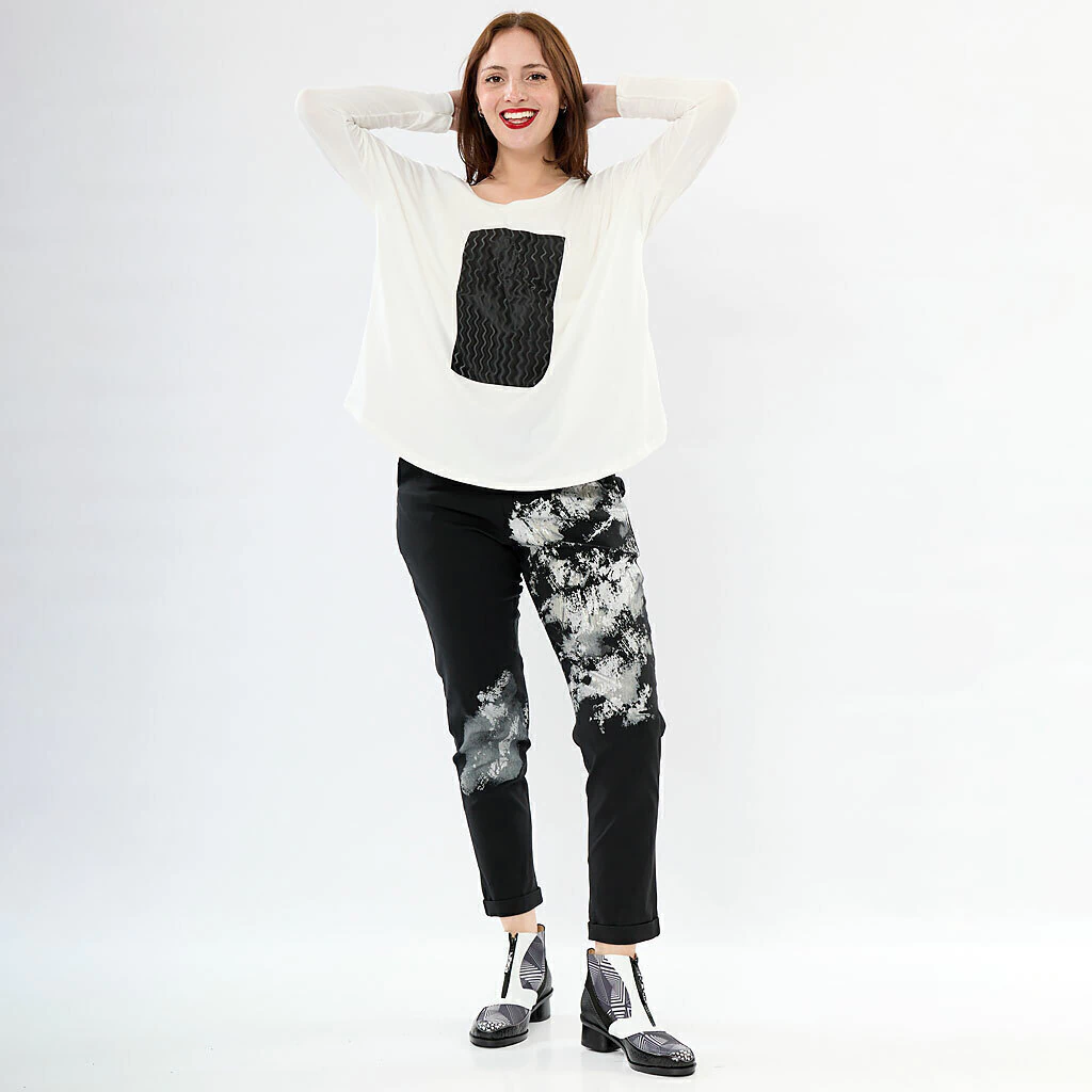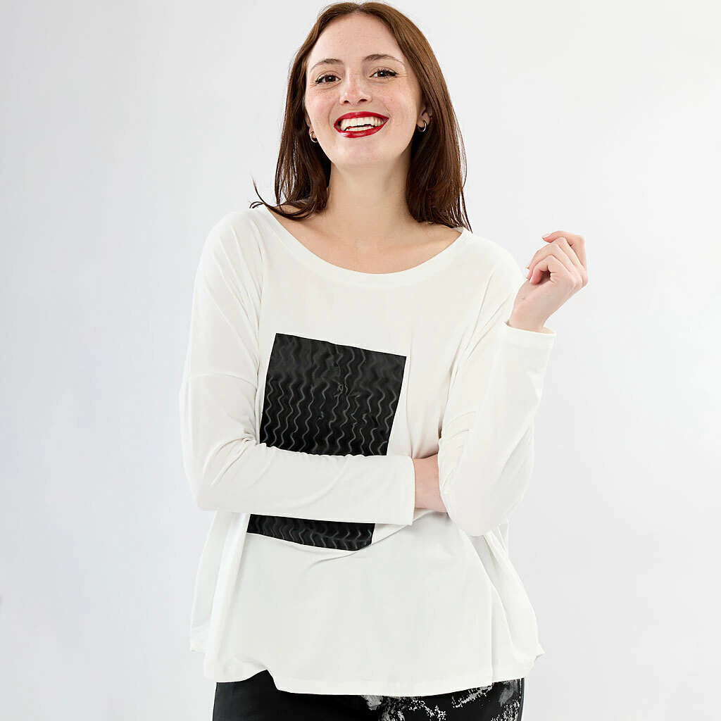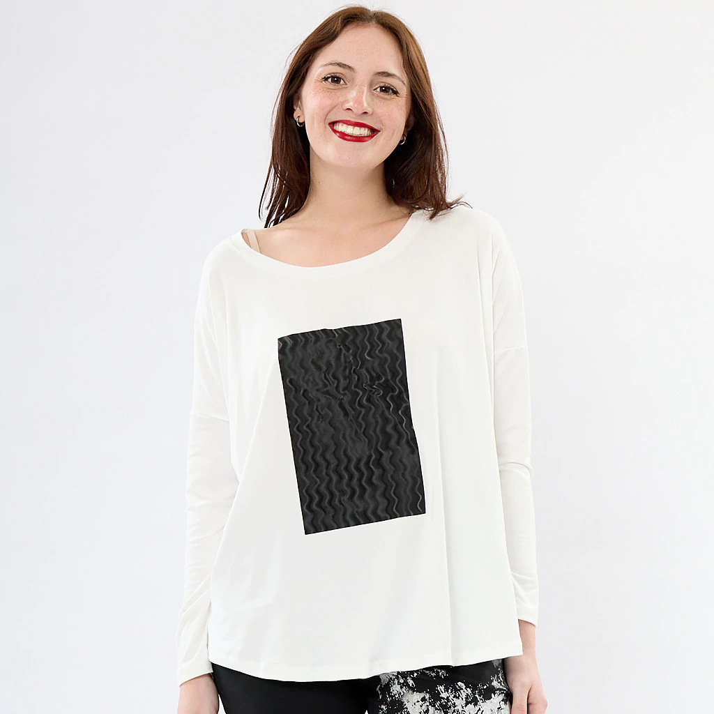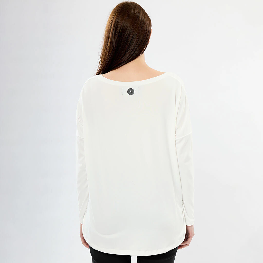 Esta remera de manga larga está confeccionada en algodón aterciopelado color blanco. El diseño es irregular, mas larga atras. Frente con estampa central holográfica. Laterales de corte redondeado y línea A. Con cuello a la base.
