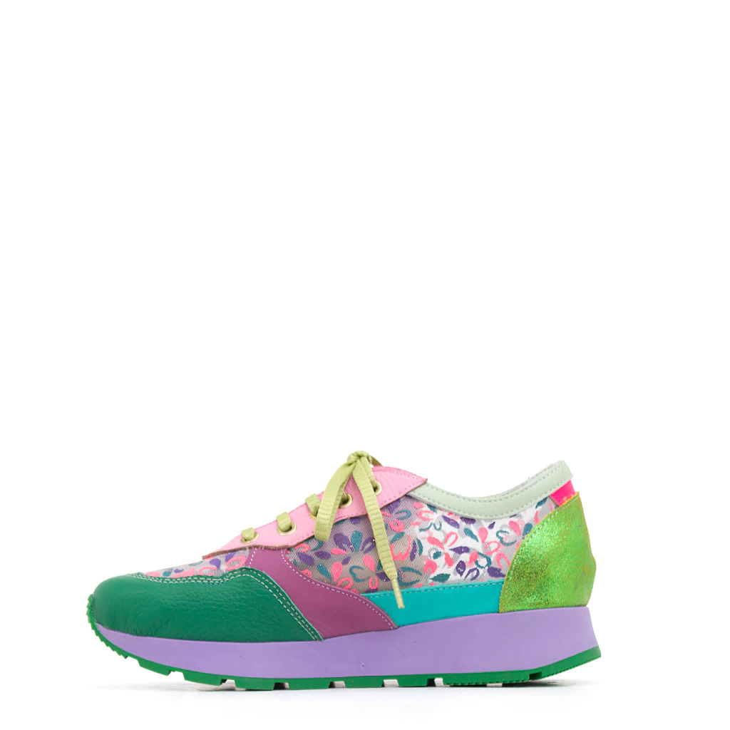 Zapatillas realizadas con variedad de cueros de diferentes colores y biyone estampado fucsia y verde. Cordones verdes. Forro cuero vacuno. Base goma antideslizante Plantilla y lengueta acolchada.