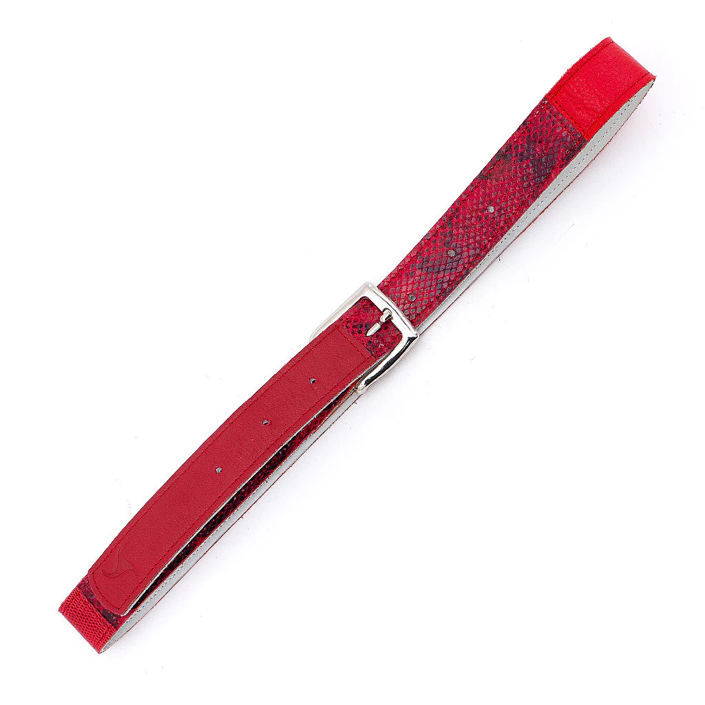 Cinturón realizado de forma artesanal en su corte y costuras, combinando cueros engamados en rojo y bordo. Hebilla nickel. Medida pase 3 cm. Medida Total 1:05 mts