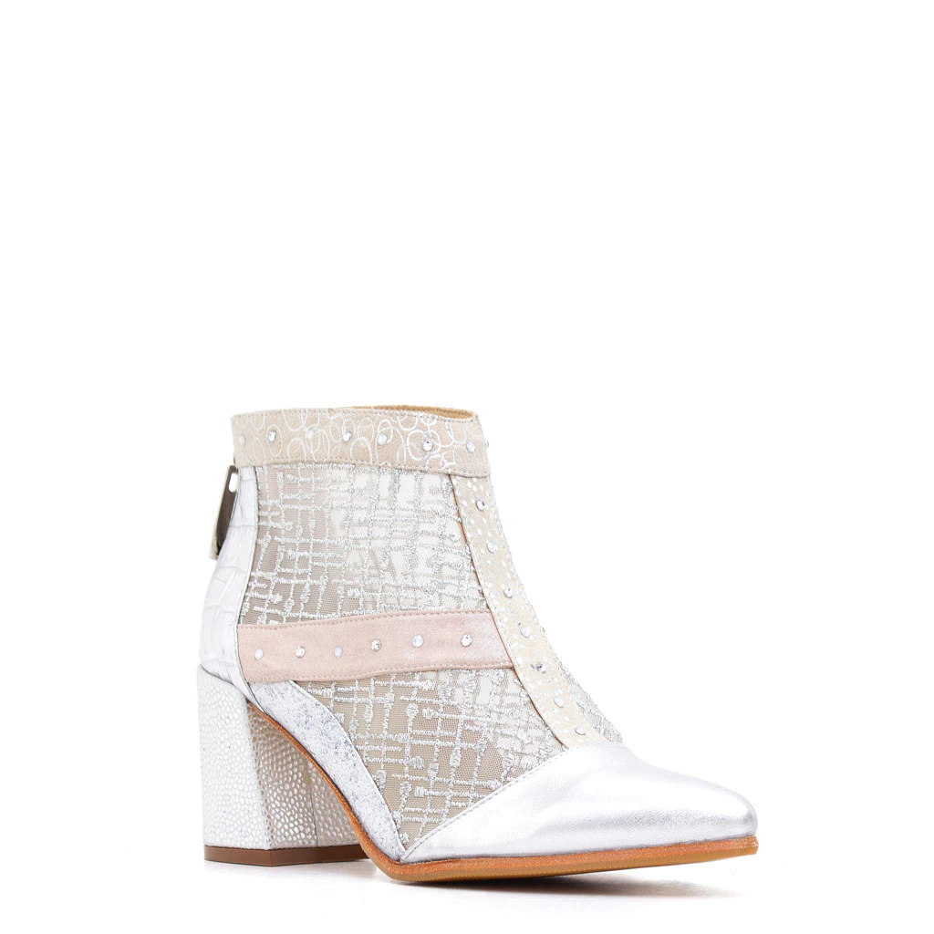 Confeccionadas en cuero grabado y liso plata mate, transfer brillante plata y nartural, estas botas destacan por su biyoné bordado en hilos plata con transparencias y cristales swky, que aportan un toque de sofisticación.