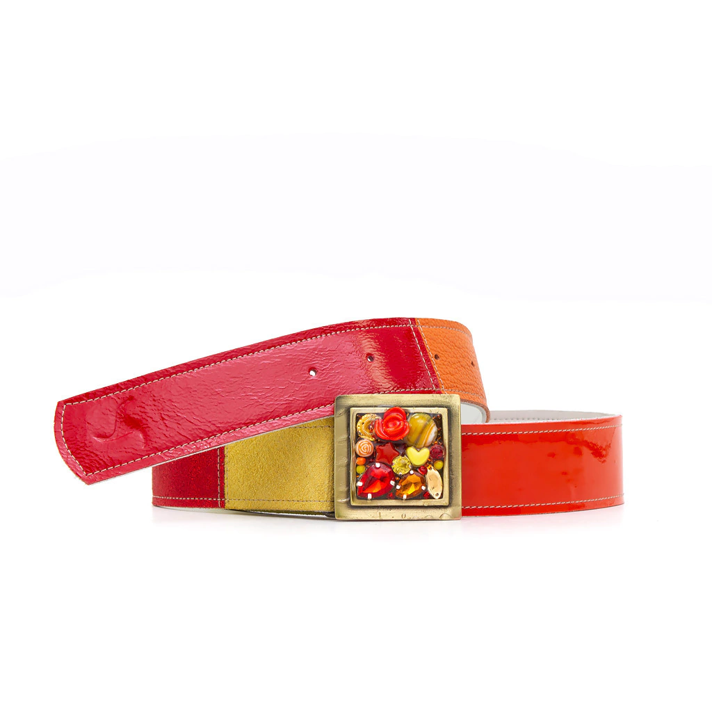 Este cinturón es mucho mas que un sujetador de prendas... su hebilla es un pequeño cuadrito que apoya sobre la mitad de tu cuerpo! Fue realizada con tecnicas mixtas, vitrofusion, cerámica y collage. Vas a llevar todas las miradas a tu ombligo!