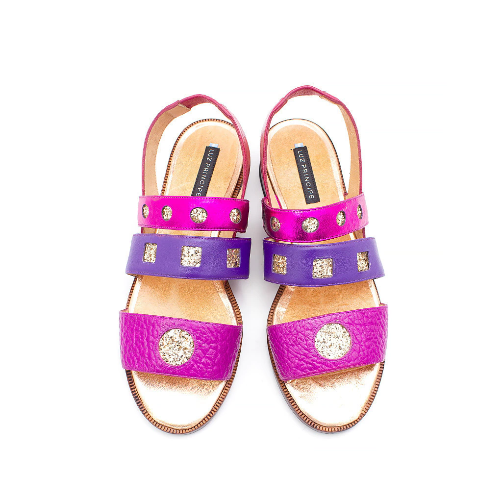 Sandalias realizada en cueros gama de violeta y fucsia, glitter oro. Taco 3 cm. Forro: cuero vacuno. Base suela y media suelina de goma febo antideslizante.