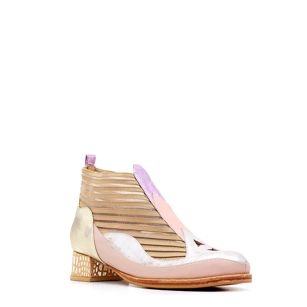 Botineta calada en la capellada, con terminacion de elastico con transparencias. Vaiedad de cueros rosa mate y metalizado y platino. Forro vacuno. Taco 3,5cm. Base suela, con media suelina goma antideslizante.