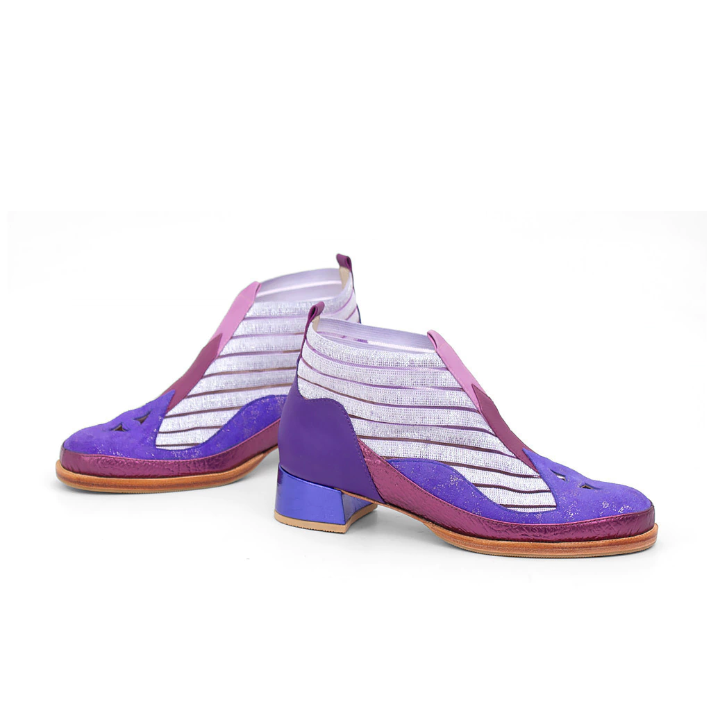 Botineta calada en la capellada, con terminacion de elastico con transparencias y lurex. Vaiedad de cueros violeta y lila, mate y metalizados. Forro vacuno. Taco 3,5cm. Base suela, con media suelina goma antideslizante.