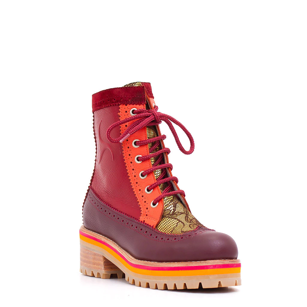 Realizados con cueros bordo, suela, bronce, naranja y coral. Cordones bordó. Forro cuero vacuno. Vira y base aislante térmica tricolor artesanal: goma natural, rojo, naranja . Cierre interno. Plataforma 2cm y taco 3cm.