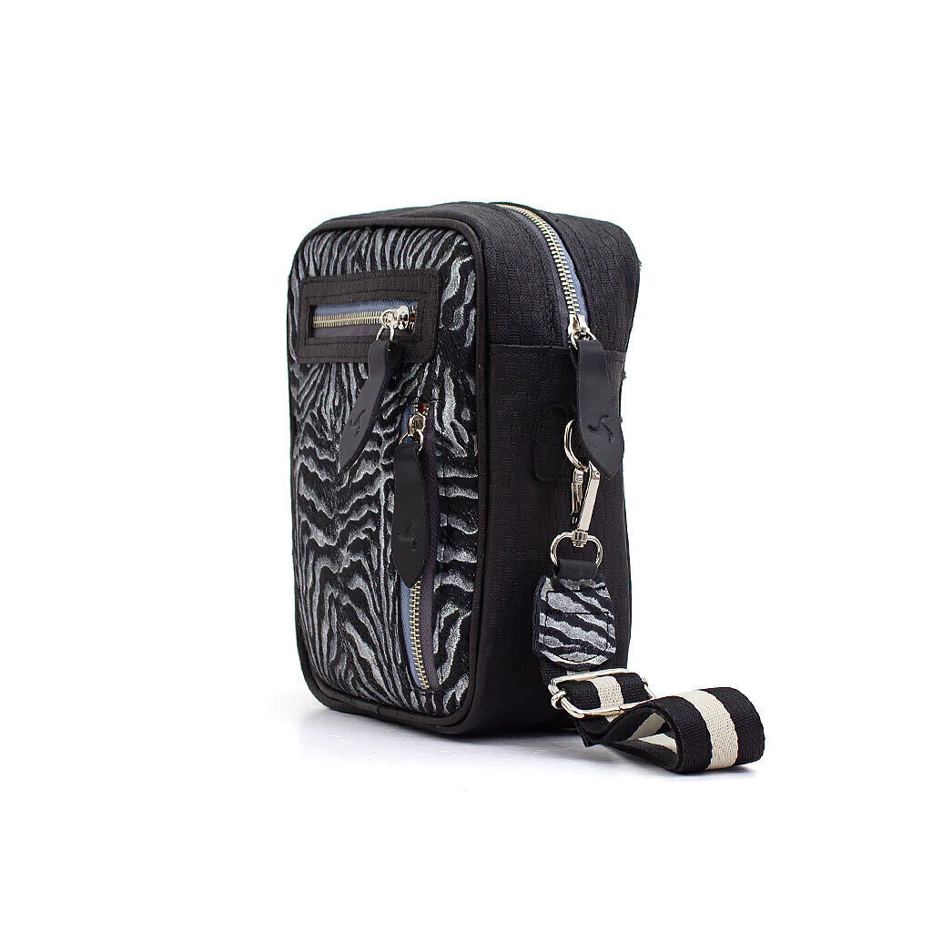 Cartera de cuero negro grabado y pelo estampado negro y plata. Bolsillos con cierre en dos tonos de gris. Pieza realizada integramente a mano. Interior forrado en gross. Capacidad de carga: Media. Medidas diametro: ancho18 cm, alto 23 cm, prof. 8 cm. Correa crossbody teblanca y negra, largo regulable: 1,40 cm.