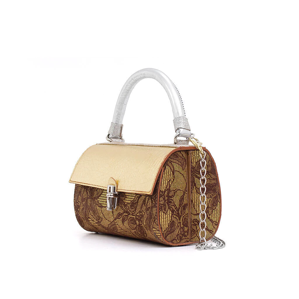 Esta confeccionada en cuero cobre y oro estampado, cuero plata y plata tornasol.