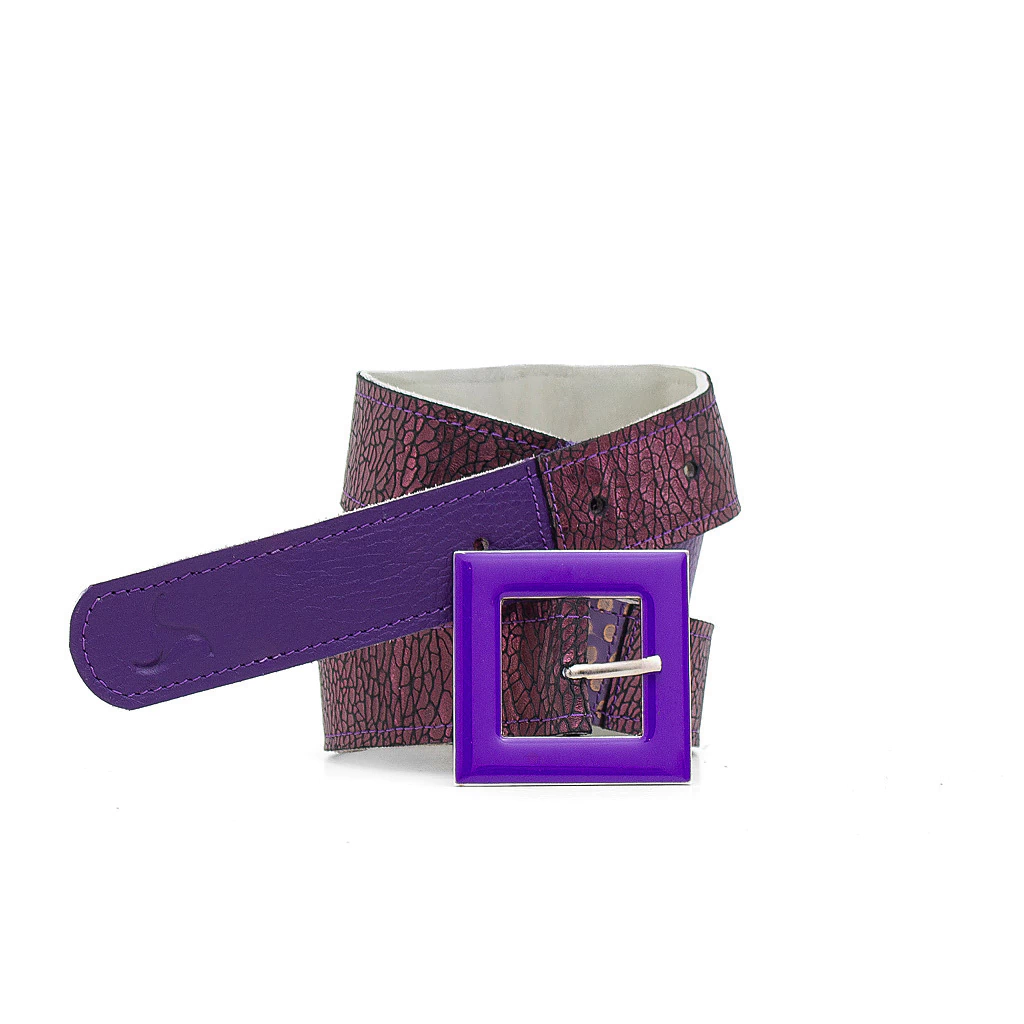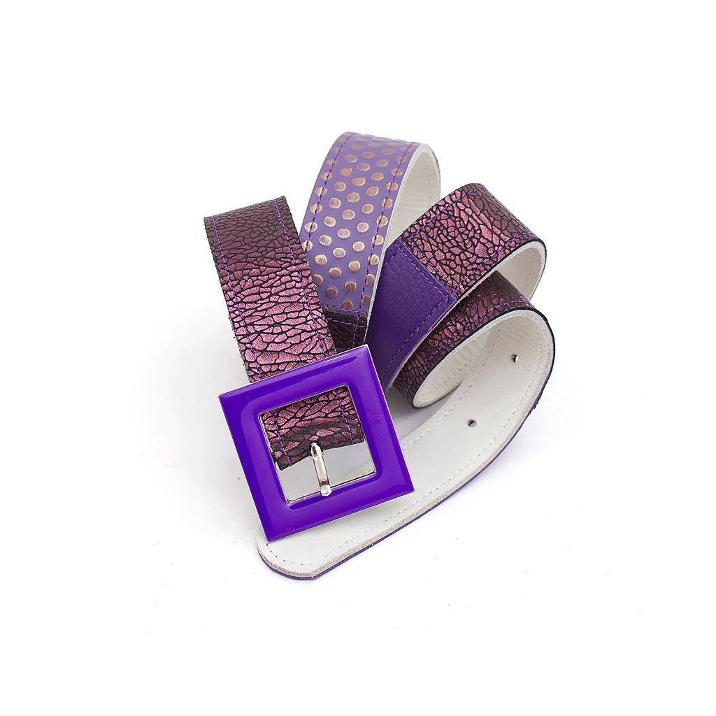 Cinturón realizado de forma artesanal en su corte y costuras combinando cueros en gama y texturas color violeta y uva. Con hebilla esmaltada violeta. Medida pase 4 cm.