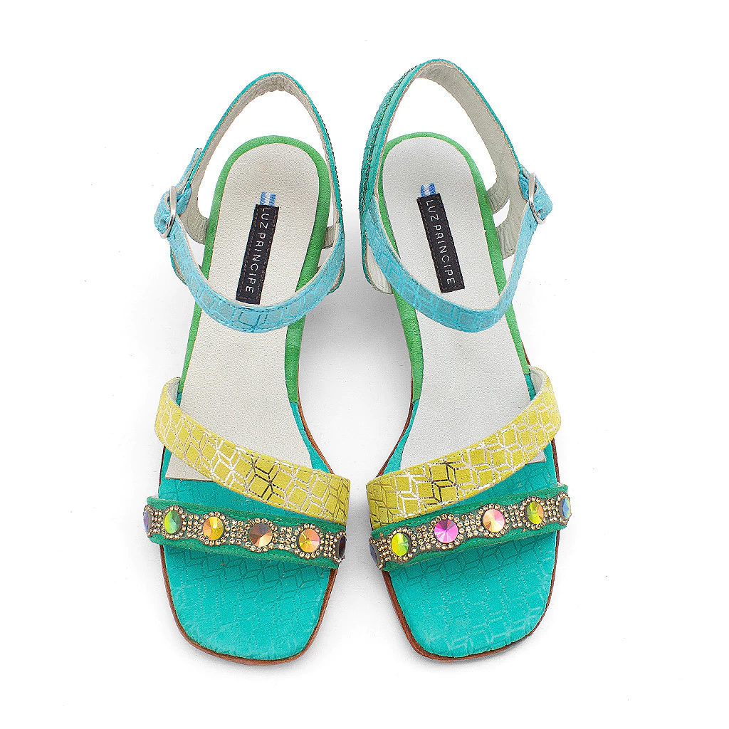 Sandalia realizada en cueros grabados y estampados en tonos verdes y turquesas, con hebilla de ajuste lateral. Talón y capellada con aplique de mini cristales tornasol. Taco 4 cm. Base suela + antideslizante Calce super comodo ideal para empeines altos, por su capellada.