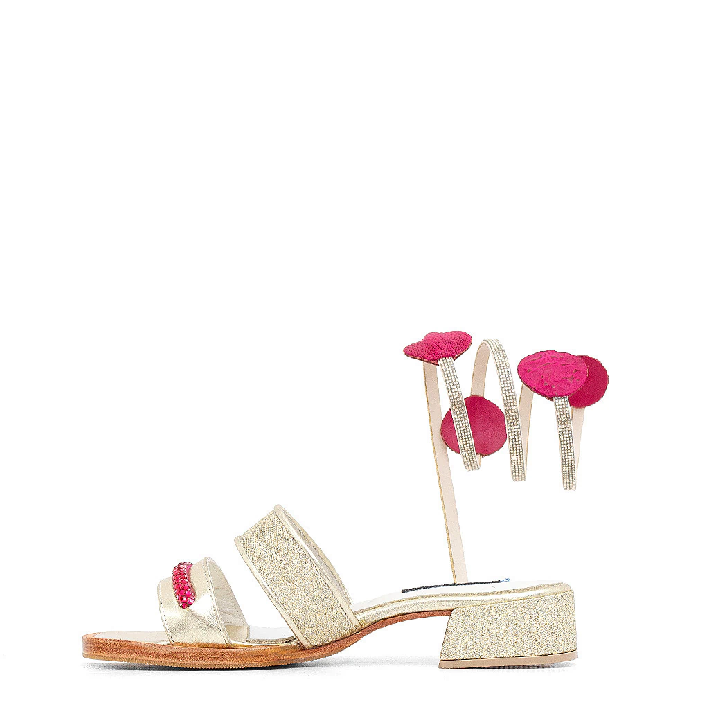 Sandalia gypsy realizada en cuero platino y glitter, acentos en piedras baguette y cueros tonos fucsia.