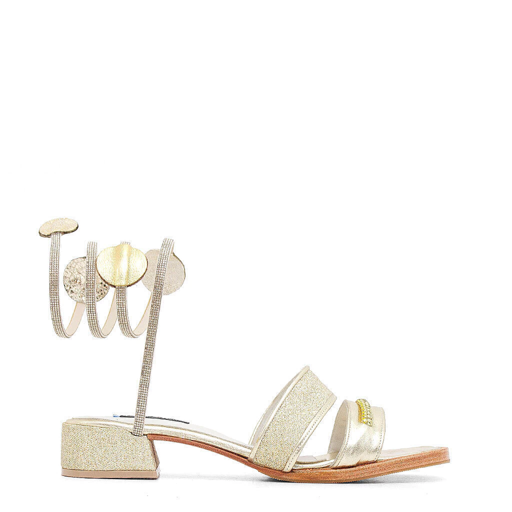 Sandalia gypsy realizada en cuero platino y glitter, acentos en piedras baguette y cueros tonos oro.