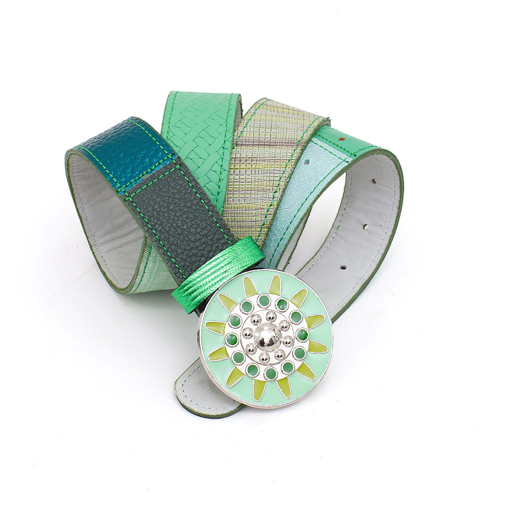 Cinturón realizado de forma artesanal en su corte y costuras combinando cueros en gama y texturas colores verdes. Con hebilla MANDLA esmaltada gama de verdes. Medida pase 4 cm.
