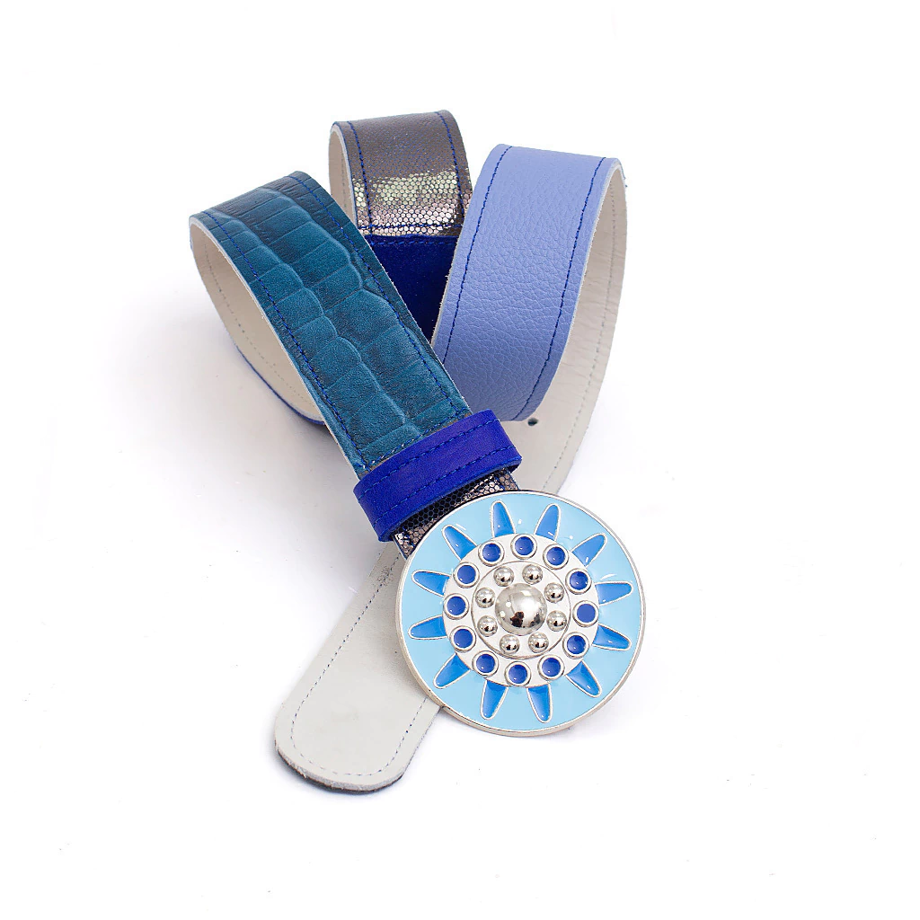 Cinturón realizado de forma artesanal en su corte y costuras combinando cueros en gama y texturas colores azules. Con hebilla MANDLA esmaltada azul y celeste. Medida pase 4 cm.