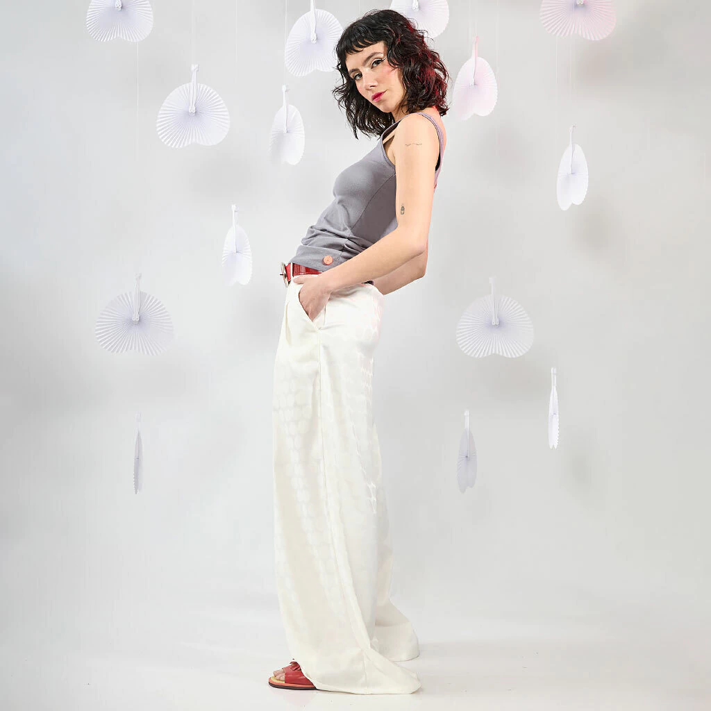WONTON es un pantalon sastre para destacar. Esta confeccionado en satiné labrado. De textura suave, combina dos tonos de blanco que generan por el contra hilo un juego de luces y sombras. Corte ancho y fluido que resulta muy comodo. Tiro medio justo debajo del ombligo.