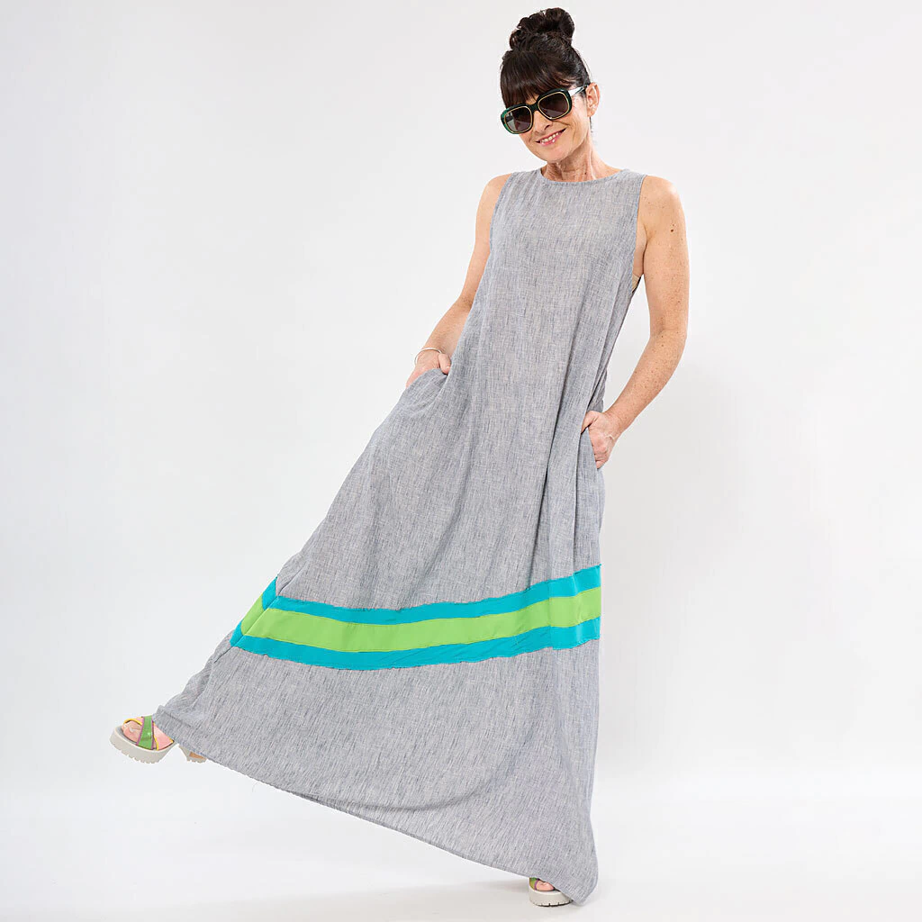 Realizado en lino gris, con apliques de cupro manzana y turquesa.