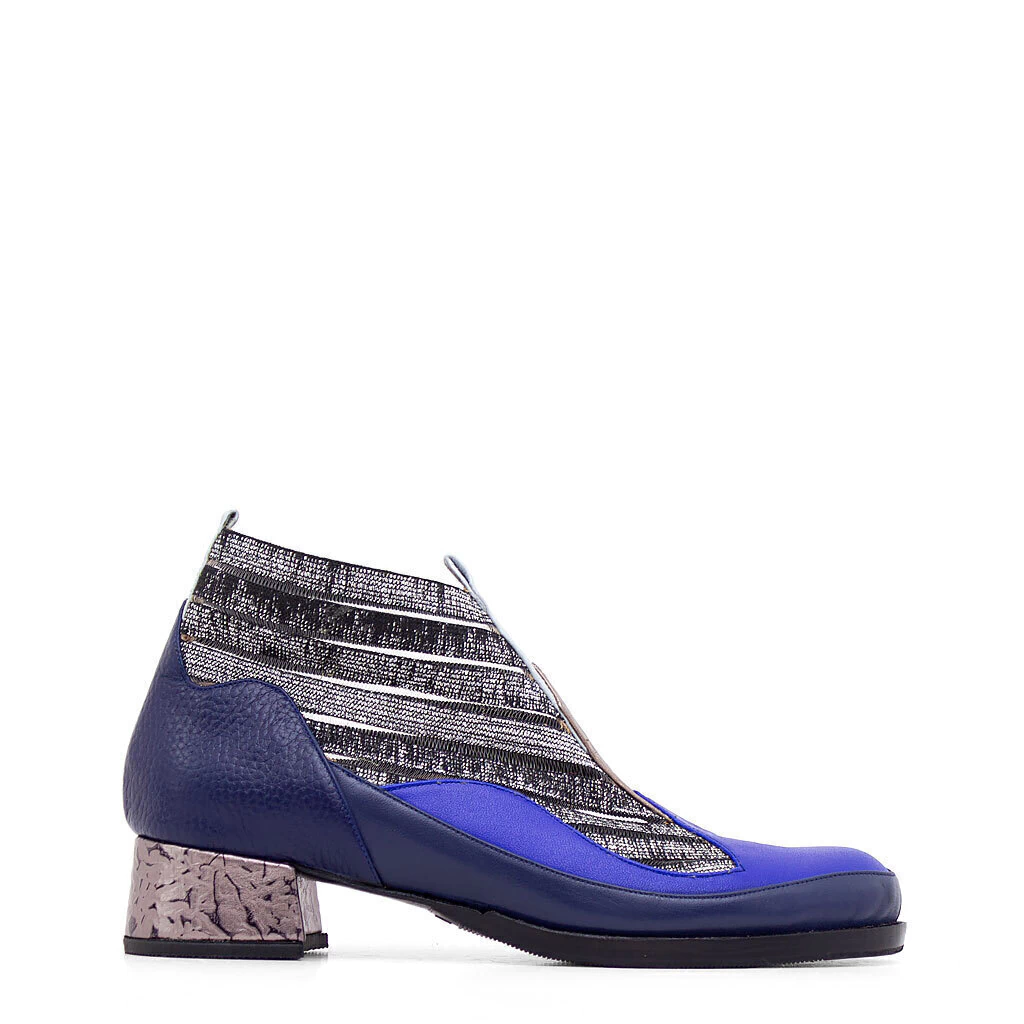 Botineta calada en la capellada, con terminacion de elastico con transparencias y lurex. Vaiedad de cueros azul, negro y peltre. Forro vacuno. Taco 3,5cm. Base suela, con media suelina goma antideslizante.