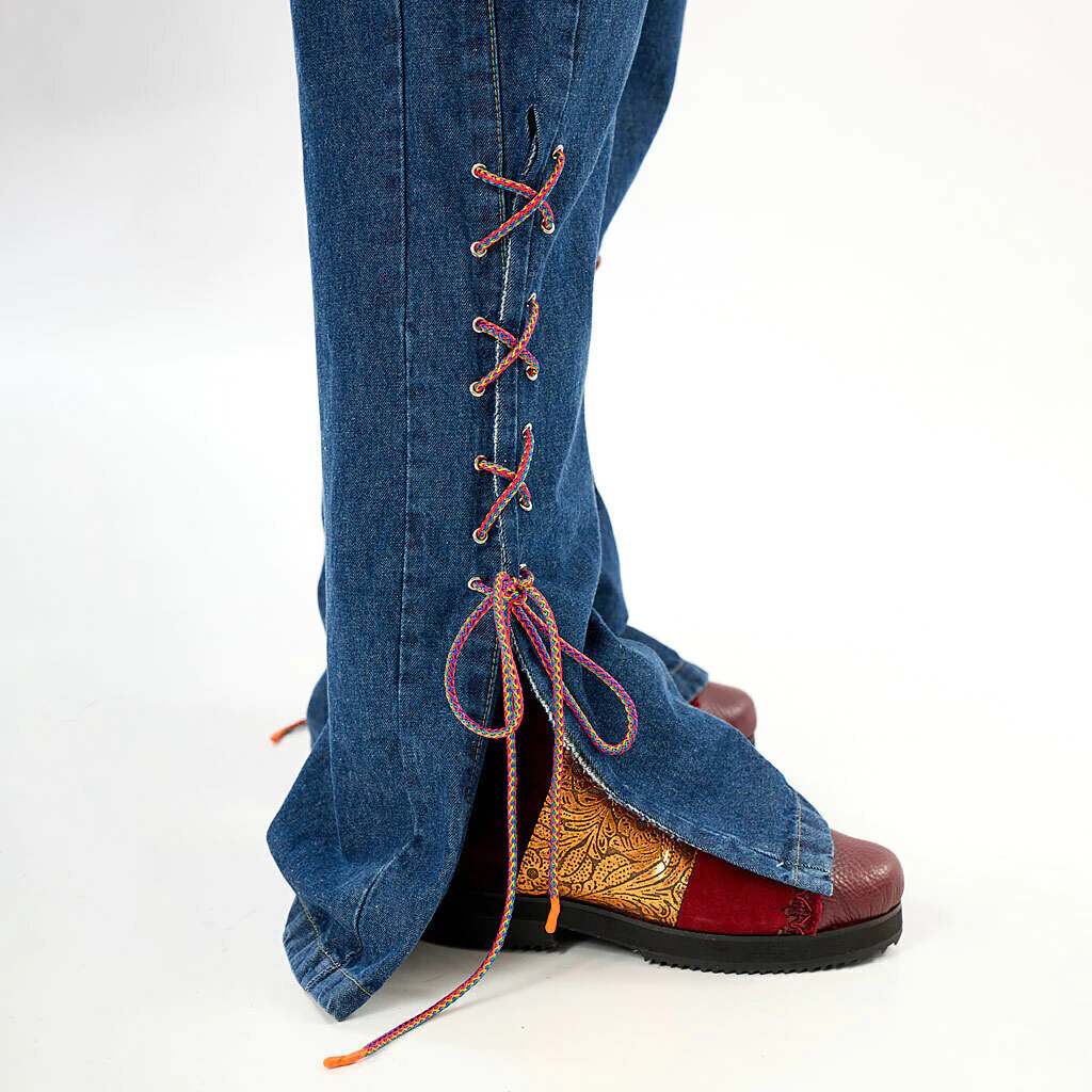 Denim FETICHE: jean azul navy de corte semi ancho. Este modelo presenta un tajo lateral con cordones multicolores y hojalillos nickel. Cintura de tiro alto y cierre. Tiene bolsillos frontales y traseros.