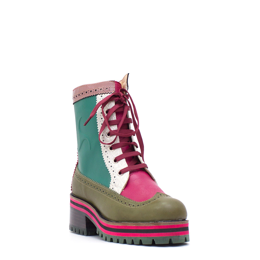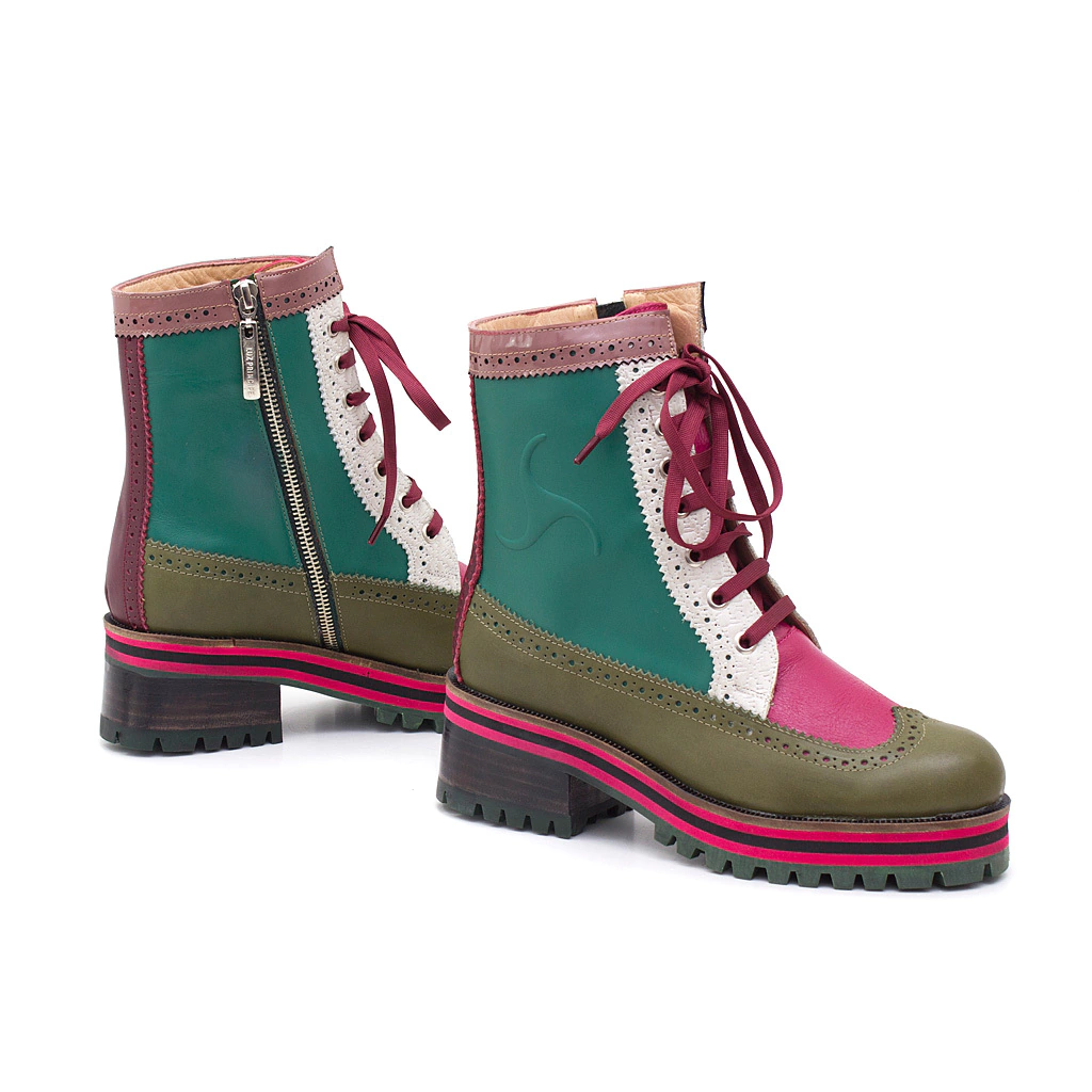 Realizados con cuero floatter verde, bordo, natural, fucsia, charol rosa viejo. Capellada picada y cordones tejidos Lp bordó. Forro cuero vacuno. Vira y base aislante térmica tricolor artesanal: goma negra y fucsia. Plataforma 2cm y taco 3cm.