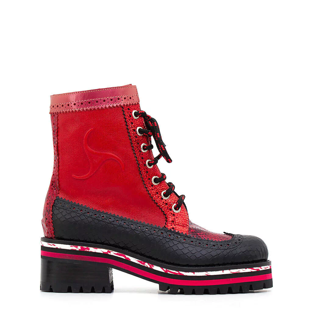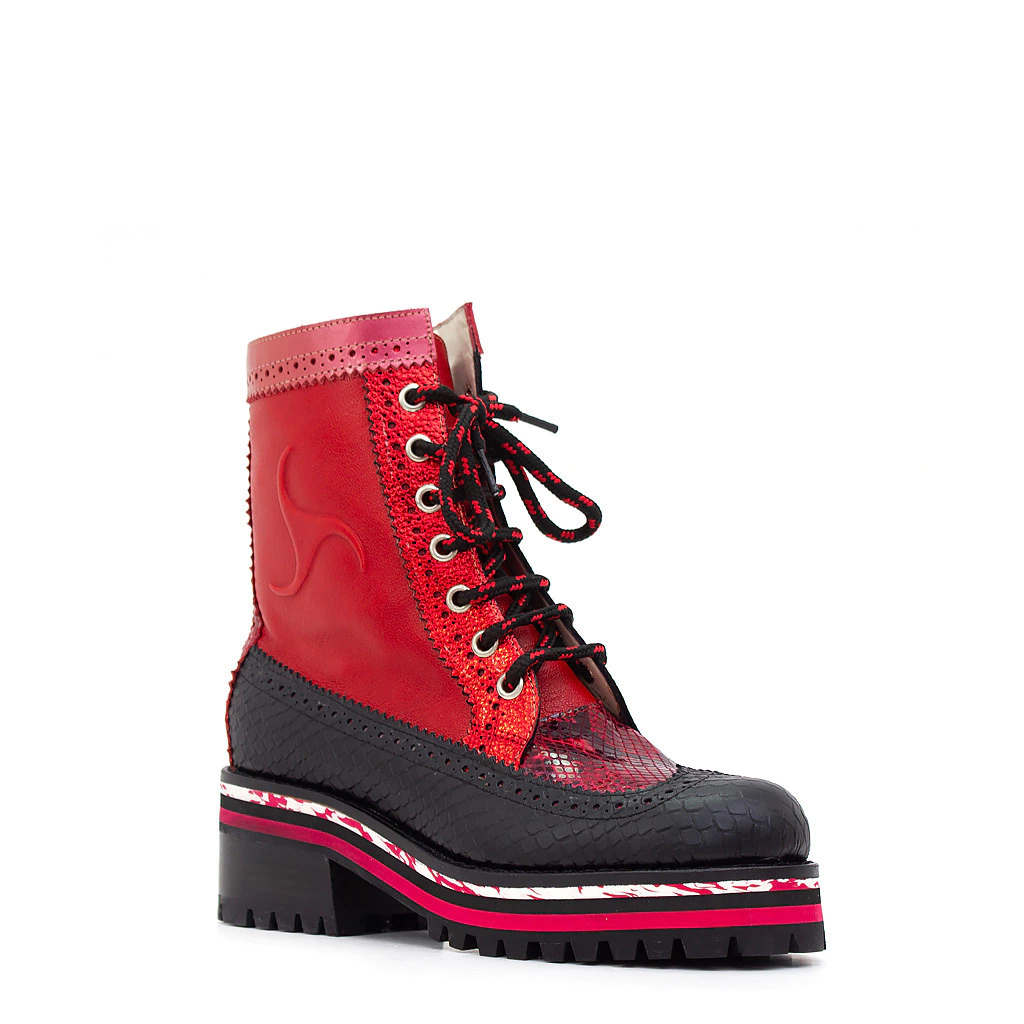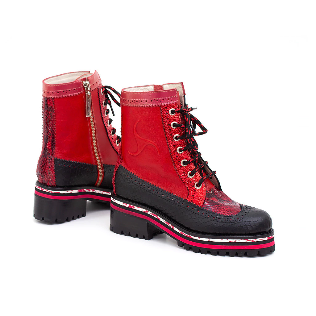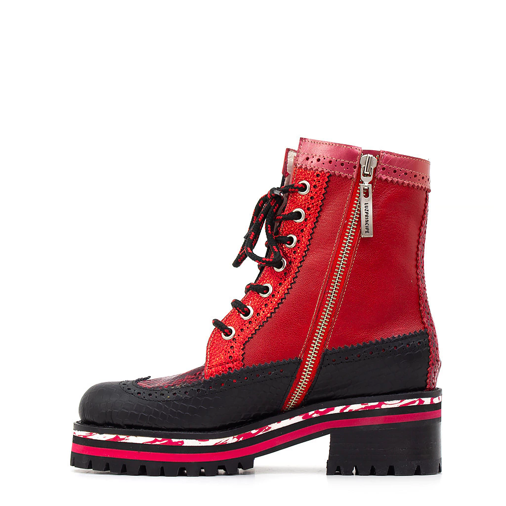 CAPELLADA cuero estampado animal print, rojo metalizado y mate, cuero negro, charol rojo nacarado. Capellada picada.
